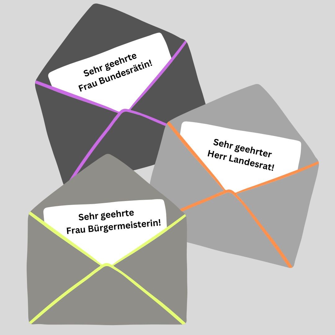 Wir wollen unsere Stimme erheben und uns Gehör verschaffen. E-Mails, persönlich an die politischen Entscheidungsträger:innen gerichtet, sind dafür gut geeignet. Wir setzen dieses Mittel in unterschiedlicher Weise bei verschiedenen Gelegenheiten ein.